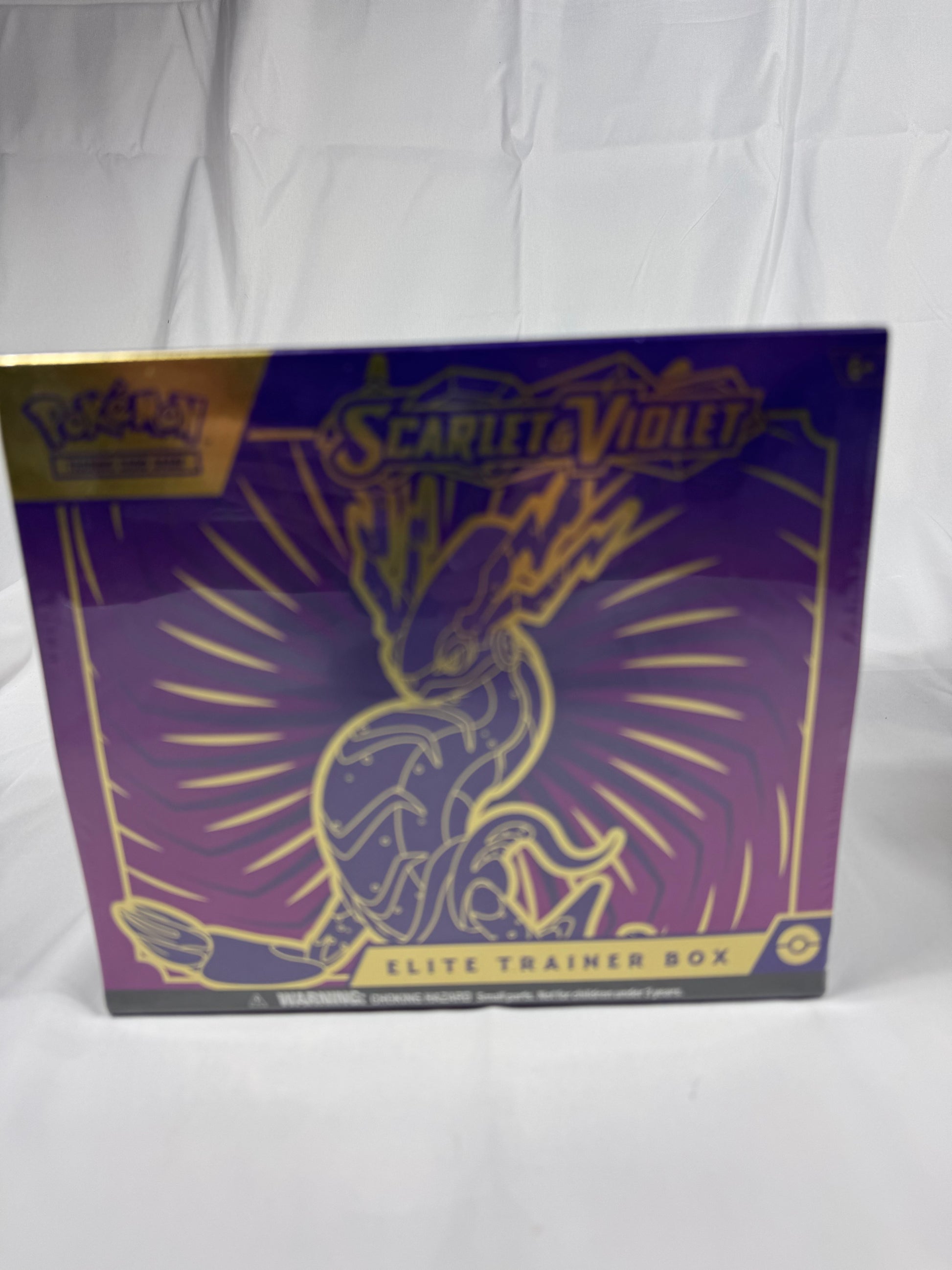 Card Text:The Pokémon TCG: Scarlet & Violet Elite Trainer Box includes: • 9 Pokémon TCG: Scarlet & Violet booster packs • 1 full-art foil promo card featuring Miraidon • 65 card sleeves featuring Miraidon • 45 Pokémon TCG Energy cards • A player’s guide to the Scarlet & Violet expansion • 6 damage-counter dice • 1 competition-legal coin-flip die • 2 plastic condition markers • A collector’s box to hold everything, with 4 dividers to keep it organized • A code card for Pokémon Trading Card Game Live